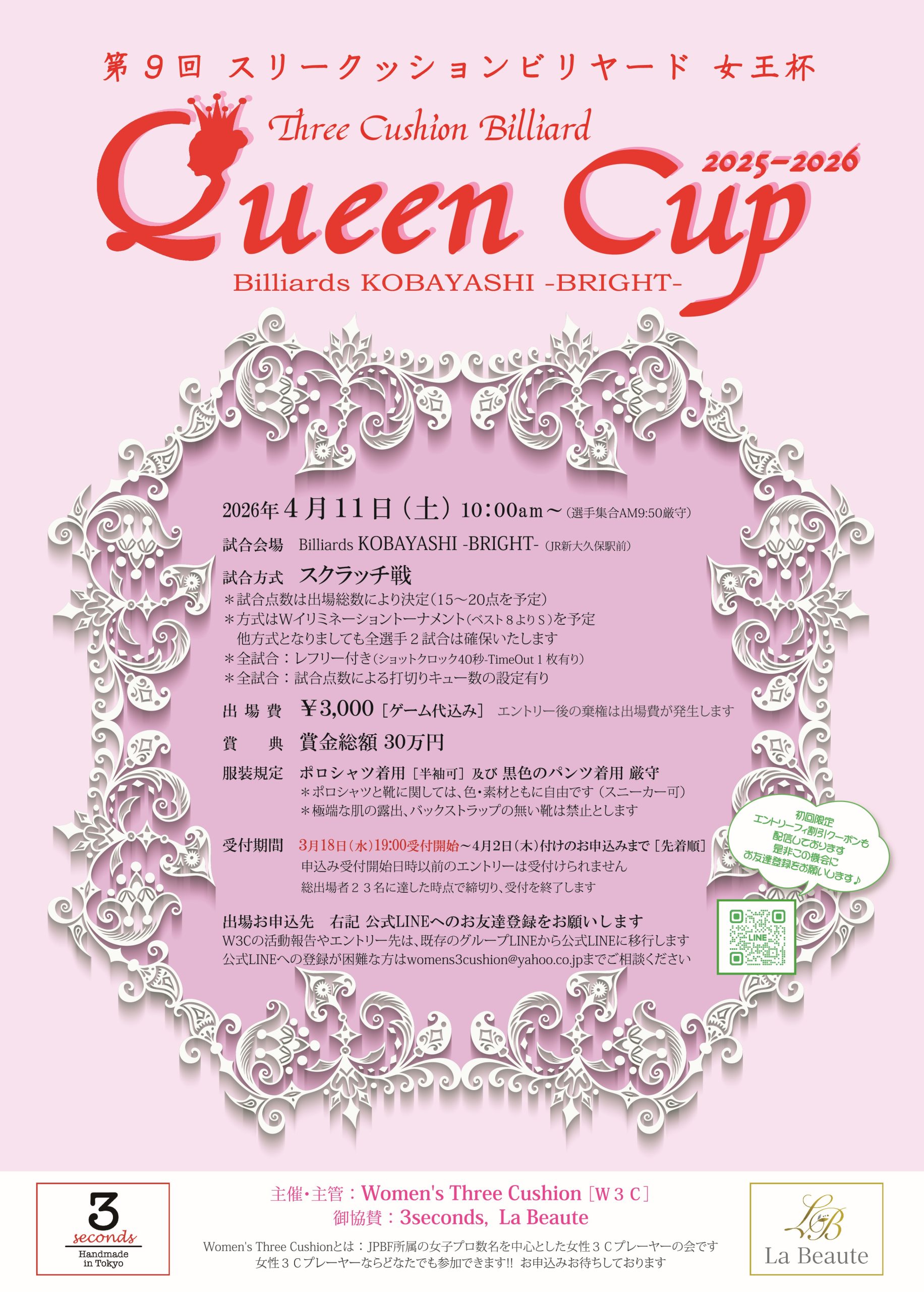 W3C (Women’s Three Cushion)より開催発表が届きましたので、ご報告いたします