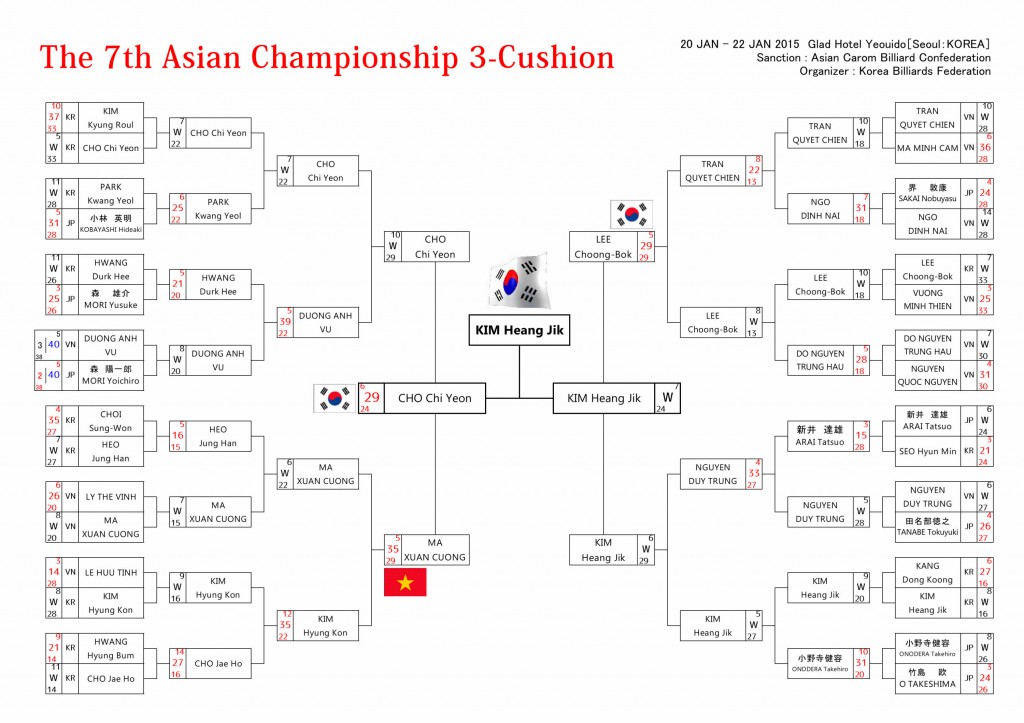 アジア選手権 [KIM Heang Jik選手] 優勝 カテゴリー: 試合結果 投稿日: 2015/01/23 1月20-22日 韓国 (ソウル) 第7回 アジア選手権大会 ~ 3C ~ 全成績です。 優 勝 : KIM Heang Jik選手(KR) 準優勝 : CHO Chi Yeon選手(KR) 3 位 : LEE Choong-Bok選手(KR) MA XUAN CUONG選手(VN) KIM Heang Jik選手2014 JAPAN CUPより写真提供:carom seminar様 Tweet